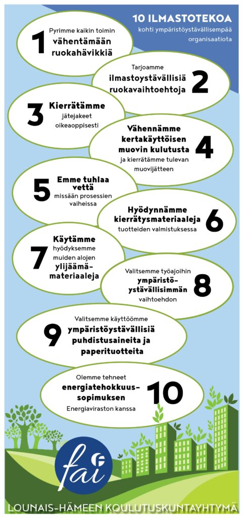 Meille vastuullisuus ja kestävä kehitys ovat strategiaan pohjautuvia arvoja ja näkyvät arjessamme koko ajan. Meillä Forssan ammatti-instituutissa vastuullisuustyötä on tehty jo yli 2000-luvun alusta eri ulottuvuuksissa: kestävä kehitys, ilmastotyö, sosiaalinen vastuu. Aluksi kehitystyö painottui vahvasti opetukseen, mutta hyvin nopeasti se ulotettiin koko organisaation toimintaan. Nykyisin yhtenä strategisena painopisteenä vastuullisuus ja kestävä kehitys ohjaavat kaikkea toimintaamme: meillä on toimintamme läpileikkaava vastuullisuusohjelma, jonka toteutumista seurataan vuosittain. FaiGreen yhteistyötiimin tehtävänä on edistää ja varmistaa strategisten tavoitteiden toteutumista.