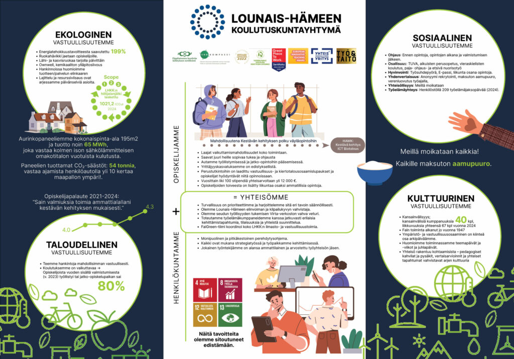 Olemme vastuullisuuden edelläkävijä, ja meille on ensimmäisenä Suomessa vuonna 2021 myönnetty Kestävä tulevaisuus oppilaitoksissa -sertifikaatti. Uusinta-auditointi toteutettiin syksyllä 2024.